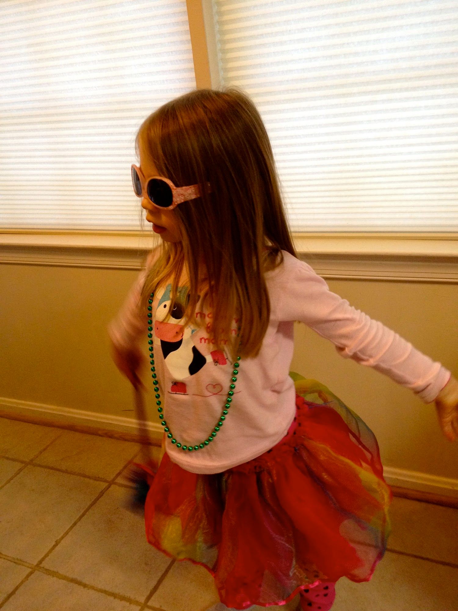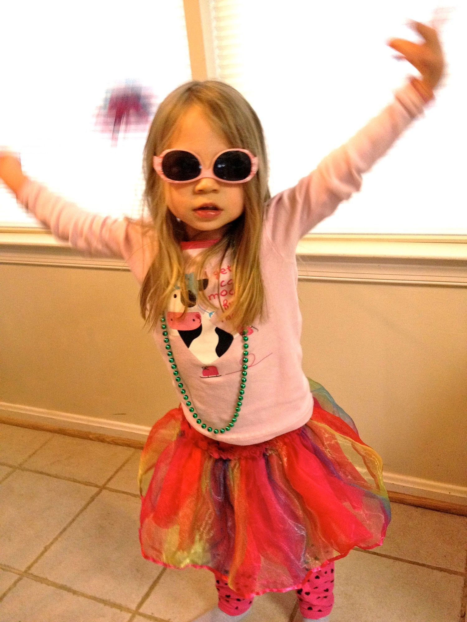 Here is my little girl on one lazy Saturday morning. She had dressed herself in her dress up clothes over her pajamas and dances for me. I think wearing her sunglasses upside down is my favorite part of her outfit! This one is for you Ms. Chi!