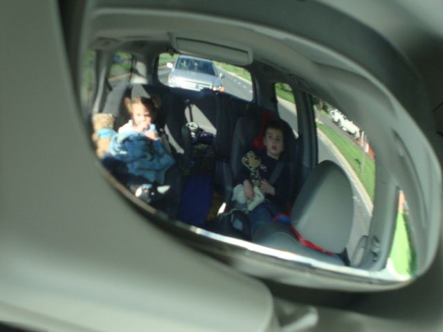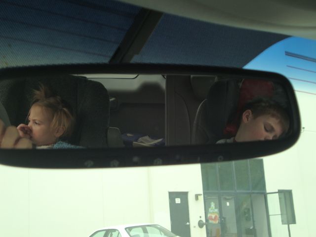 A rearview mirror shot. Buggy waiting to go into soccer, and Boogie fast asleep.