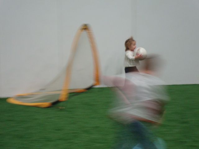An interesting picture before soccer class. My daughter in the background, and my son (the blur) in the foreground. This pretty much sums up my day. My daughter methodical and independent, and my son, a constant blur of energy and enthusiasm.