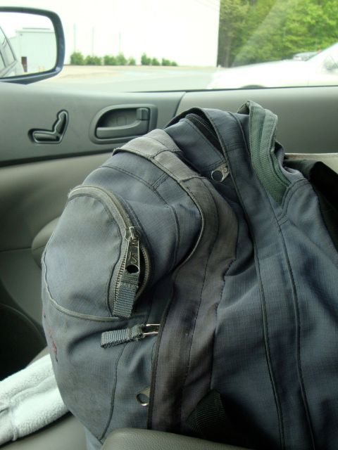 My husband's old law school backpack, now serving a higher purpose as our diaper bag.